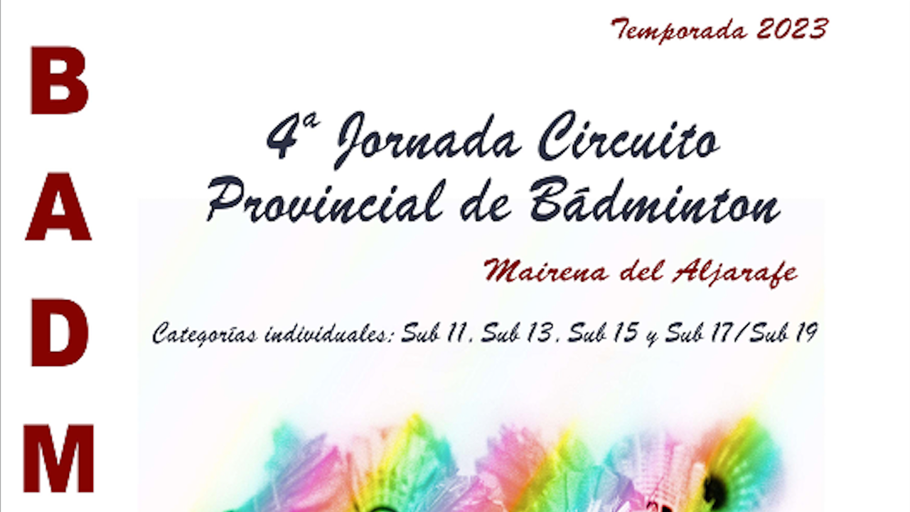 El próximo 25 de marzo se pone en marcha la cuarta jornada del Circuito Deportivo Provincial de Bádminton, un evento deportivo con carácter promocional e interés en el fomento de la participación en las categorías base. Esta nueva y penúltima jornada será celebrada en el municipio de Mairena del Aljarafe.