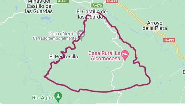 La descripción de la ruta se va a realizar desde el Cementerio del Castillo de las Guardas. Se sigue calle abajo hasta pasar unas naves y hacia la derecha entre muros de piedra seca en plena Dehesa de Sierra Morena. El camino está delimitado por los linderos de las incas y coincide con el PR-A 320 hasta llegar a las Cañadillas. Después se continúa bordeando incas de ganado bravo, hasta llegar a la vía pecuaria “Vereda de los Camellos”, camino que se sigue hasta desviarnos al “Camino de la Sardina”, donde el paisaje cambia y el terreno se vuelve más ondulado.
