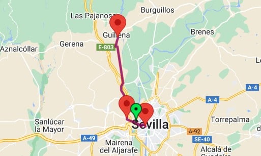 Allí se disfruta de la antigua ciudad Romana de Itálica antes de ponerse en marcha de nuevo hasta la Algaba. Luego se supera el cauce de Arroyo de los Molinos y se llega a Guillena, al ayuntamiento, donde está el fin del recorrido.