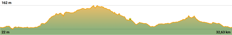 El trayecto mantiene un nivel de elevación bastante estable durante la mayoría de la ruta. El inicio del trayecto empieza a 34 metros de altura y en su máxima elevación llega a los 162 metros. Después del ascenso a 162 metros la ruta no vuelve a esa altura, pero hay otra subida a 100 metros de altura. El desnivel positivo es de 230 metros, al ser tan baja en un circuito de 32,6 km la elevación es moderada