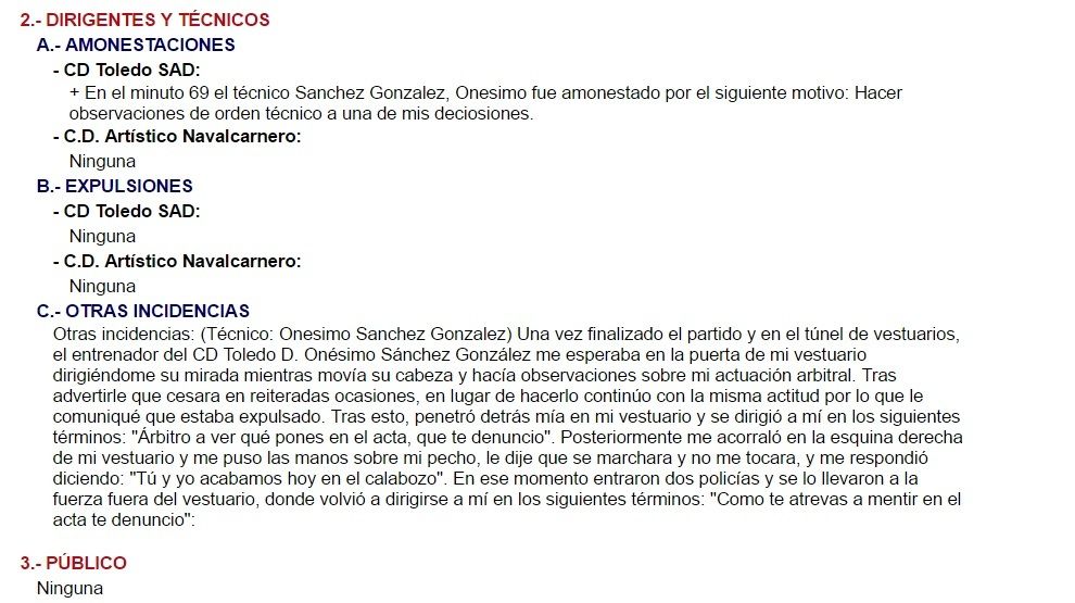 Onésimo Sánchez, actual entrenador del Toledo, ha protagonizado una de las escenas más atípicas de los último años. El encuentro enfrentaba al Toledo contra el Navalcarnero del Grupo II de Segunda B. El técnico del conjunto castellanomanchego, tras finalizar el encuentro, 'persiguió' al colegiado Juan Peña Varela hasta el vestuario y allí, según el 'trencilla' , le increpó e incluso le amenazó y así lo ha reflejado en el acta del partido. "Una vez finalizado el partido y en el túnel de vestuarios, el entrenador del CD Toledo, Onésimo Sánchez me esperaba en la puerta de mi vestuario dirigiéndome su mirada mientras movía la cabeza y hacía observaciones sobre mi actuación arbitral. Tras advertirle que cesara en reiteradas ocasiones, continuó en la misma actitud y le comuniqué que estaba expulsado. Tras esto, penetró detrás mía en el vestuario y se dirigió a mí en los siguientes términos: "Árbitro, a ver que pones en el acta que te denuncio". Posteriormente me acorraló en la esquina derecha de mi vestuario y me puso las manos sobre mi pecho, le dije que se marchara y no me tocara y me respondió: "Tu y yo acabamos hoy en comisaría". En ese momento entraron dos policías y se lo llevaron a la fuerza fuera del vestuario donde volvió a dirigirse a mí en los siguientes términos: "Como te atrevas a mentir en el acta te denunció".