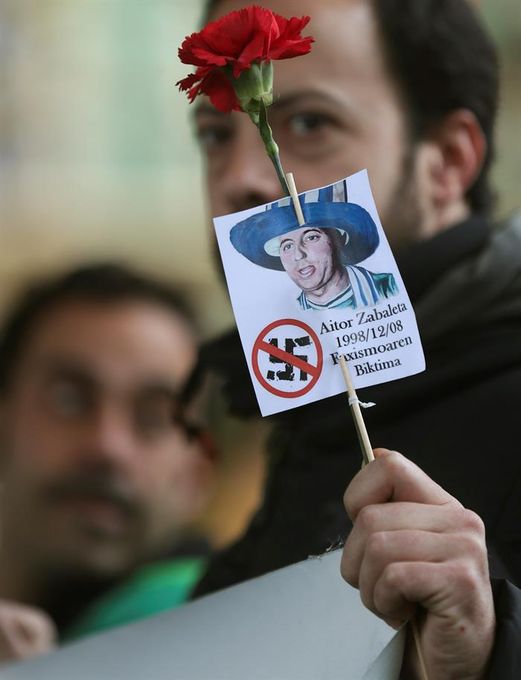 Los participantes, varios de los cuales portaban ikurriñas y claveles con la fotografía de Zabaleta, han permanecido varios minutos en silencio, mientras un grupo de tres personas han entonado una canción en recuerdo del hincha realista.