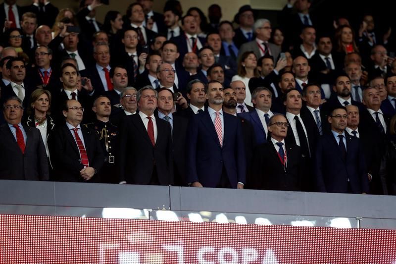 Y, cómo no, el momento de la controversia, ya irremediablemente ligado a este encuentro, llegó justo antes del acontecimiento central, el deportivo, con el asunto que tantos ríos de tinta y comentarios ha provocado en los últimos años, la respuesta de parte de la afición del Barcelona al himno de España.