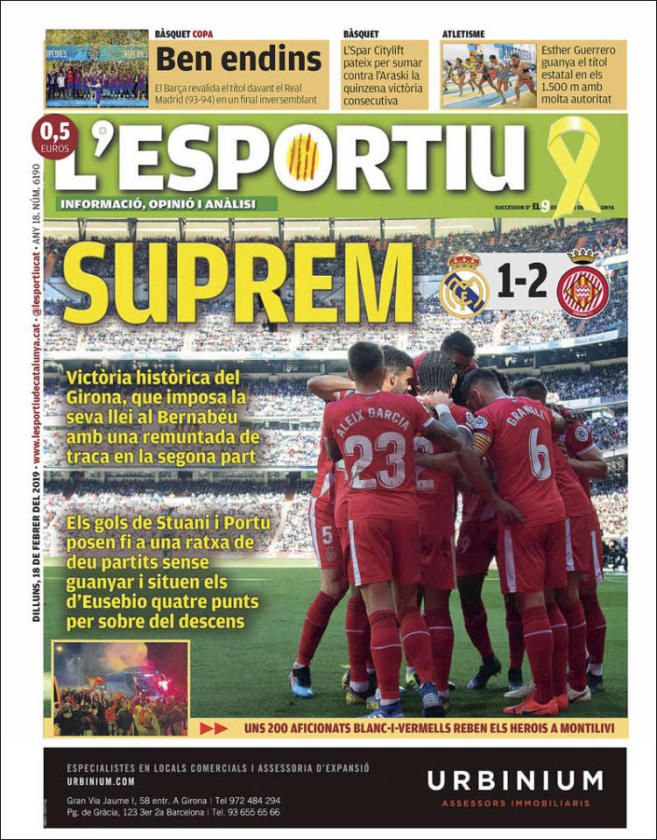 El Real Madrid de baloncesto amenaza incluso con dejar la ACB, tras las polémicas del partido disputado en la noche de este domingo ante el Barça Lassa. Al equipo blanco de fútbol no le fue mejor, ante un Girona FC que logró un triunfo histórico, según reflejan varias portadas de la prensa deportiva de este lunes.