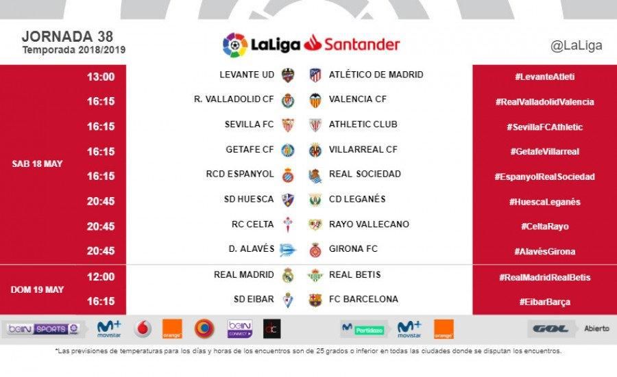 Ya para el domingo solo quedan dos partidos. El Betis visitará el Bernabéu a las 12:00 horas mientras que el Barcelona hará lo propio en Ipurua para enfrentarse al Eibar a las 16:15 horas y cerrar así la temporada 2018/19.