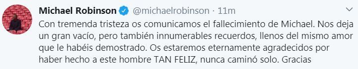 "Con tremenda tristeza os comunicamos el fallecimiento de Michael. Nos deja un gran vacío, pero también innumerables recuerdos, llenos del mismo amor que le habéis demostrado. Os estaremos eternamente agradecidos por haber hecho a este hombre TAN FELIZ, nunca caminó solo. Gracias".