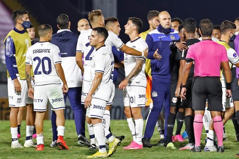 Acto seguido, los futbolistas de ambos equipos se intercambiaron empujones, sin mayores consecuencias.
