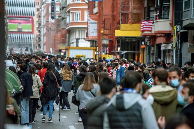Entre continuos cánticos a favor del Athletic, bufandas y banderas, tras la hora de comer la aglomeración apenas dejaba el paso libre por la calle, donde no se respetaba la distancia de seguridad y los grupos eran de más de las cuatro personas como dicta la normativa por la pandemia.