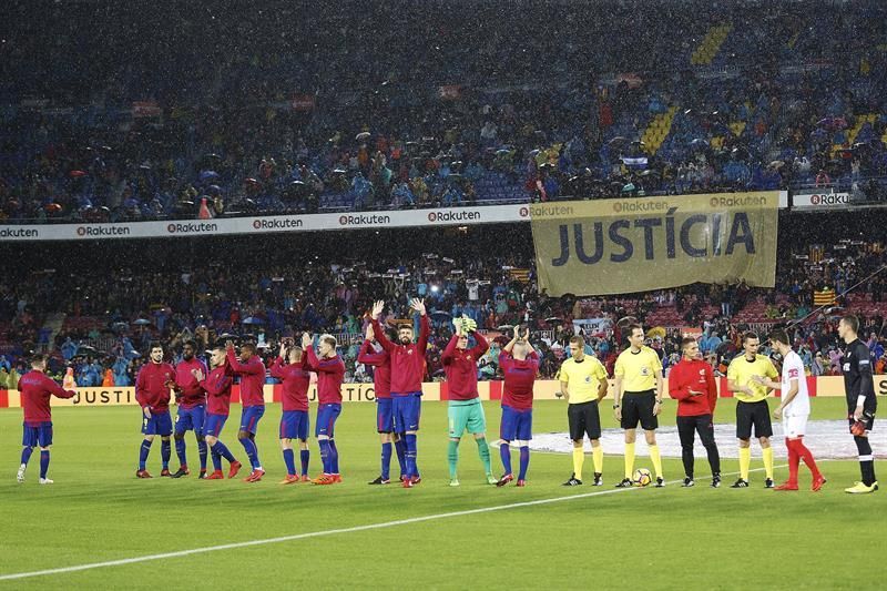 Antes del inicio del partido, el club desplegó una inmensa bandera catalana situada en el lateral del estadio, a la que le acompañaron dos lonas con la palabra justicia escrita en catalán y en inglés.