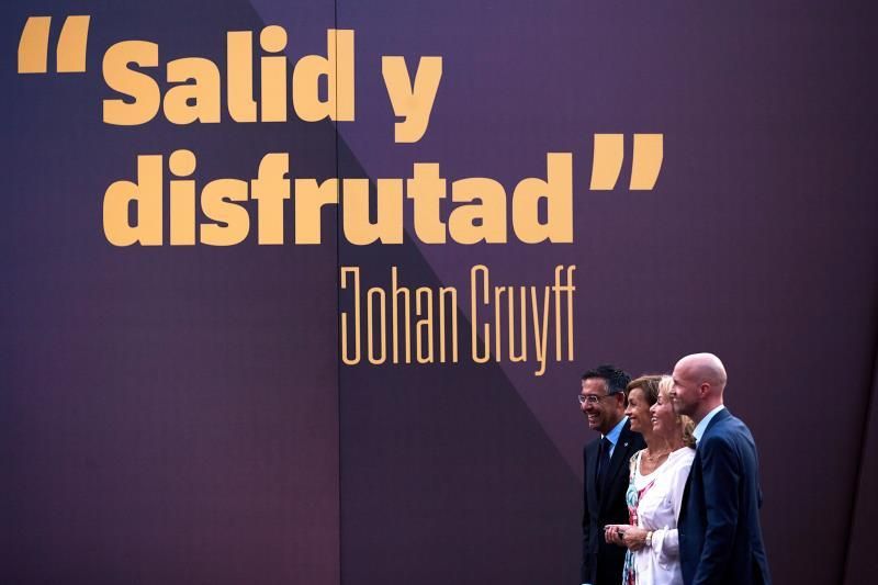 El presidente de la entidad azulgrana, Josep Maria Bartomeu, acompañó a la esposa de Cruyff, Danny, y a sus hijos, Jordi y Susila, en el momento en el que se desveló el diseño de la escultura, que representa una imagen en su etapa como capitán del primer equipo azulgrana, enfundado con el número '9' y dando indicaciones con el brazo.