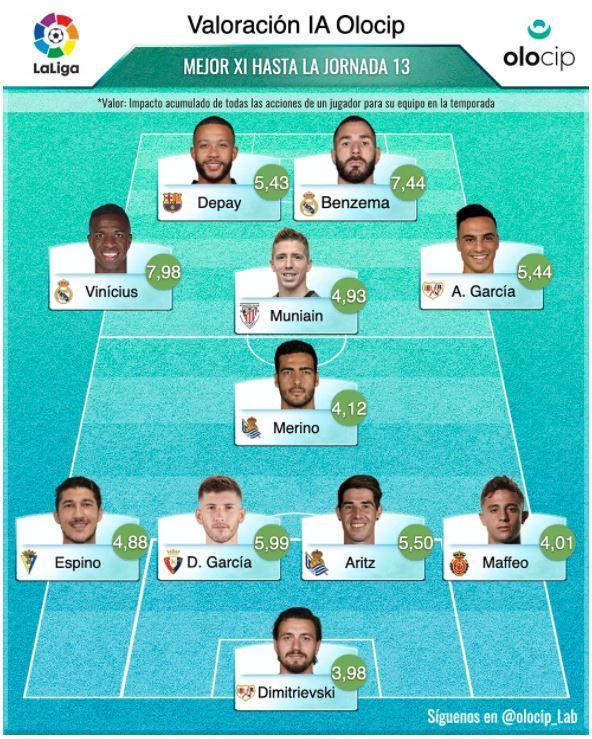 El XI de jugadores de LaLiga con más impacto según Olocip está formado por Dimitrievski (Rayo Vallecano) en la portería; Aritz Elustondo (Real Sociedad) y David García (Osasuna) como centrales; lateral izquierdo para Pacha Espino (Cádiz) y derecho para Pablo Maffeo (Mallorca). El centro del campo estaría constituido por Mikel Merino (Real Sociedad) como pivote, Álvaro García (Rayo Vallecano) y Vinícius Jr (Real Madrid) en las bancas y Muniain (Athletic de Bilbao) como enganche. En punta de ataque, una dupla formada por Memphis Depay (FC Barcelona) y Karim Benzema (Real Madrid).Una selección de futbolistas en base a la IA en el que aparecen algunos futbolistas de mucho prestigio y valor como Benzemá Depay o Vinicius, reservados a unos pocos equipos, y otros más interesantes, al alcance de los mortales. Un once, el elaborado por Olocip, al que seguramente Monchi y otros directivos no le habrán perdido el ojo.