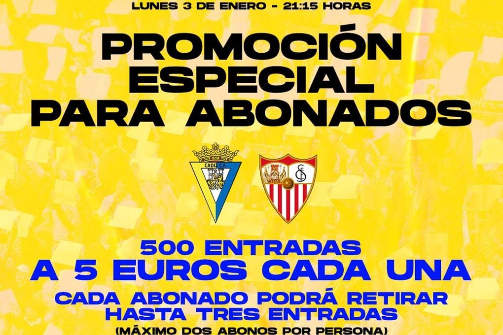 Otro rival de entidad que se cruza en el camino del conjunto amarillo, que hasta la fecha no conoce la victoria como local en LaLiga este curso. Por ello, la entidad cadista desea que el otrora Carranza sea una caldera, habiendo creado una promoción de 500 entradas a cinco euros cada una. Cada abonado del Cádiz CF, según ha anunciado el club, podrá retirar tres entradas con máximo dos abonos por persona. Dicha promoción sólo será accesible en la taquilla del estadio cadista.