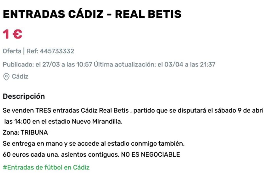 Algunos están intentando sacar rédito del deseo por hacerse con una entrada de cara al partido y en algunas web de compraventa aparecen ya anuncios en los que se venden las entradas para el derbi. “Se venden TRES entradas Cádiz Real Betis , partido que se disputará el sábado 9 de abril de 2022 a las 14:00 en el estadio Nuevo Mirandilla. Zona: TRIBUNA Se entrega en mano y se accede al estadio conmigo también. 60 euros cada una, asientos contiguos. NO ES NEGOCIABLE”, es uno de los anuncios que se pueden ver en dicha página.