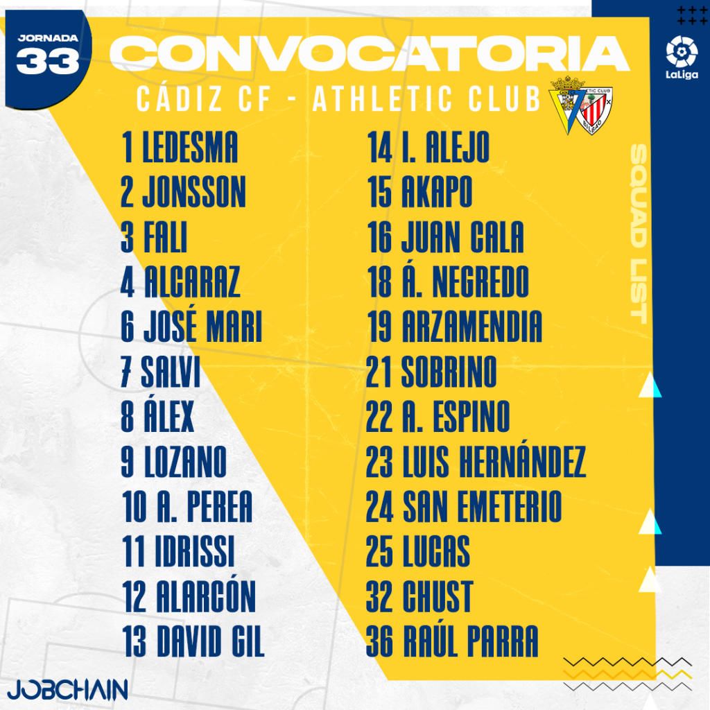 El Cádiz Club de Fútbol ha dado a conocer la convocatoria para el partido que le enfrenta mañana en el estadio Nuevo Mirandilla, a partir de las 20:00 horas, contra el Athletic Club en el que intentará ratificar las buenas sensaciones que está dando desde que llegó Sergio González al banquillo amarillo y seguir encarrilando su permanencia en LaLiga por una temporada más.