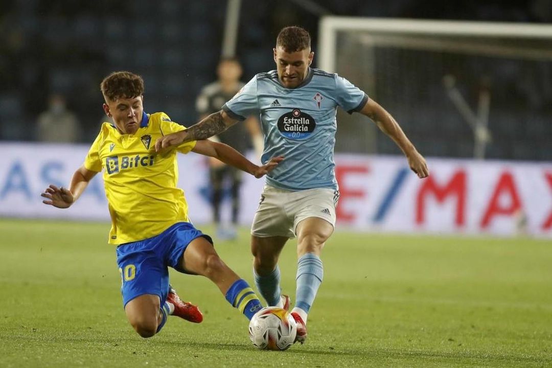 Álvaro Bastida luchando un balón frente a Javi Galán, del CeltaLuisma Sánchez