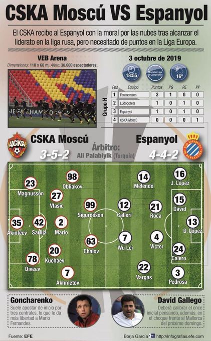 Moscú/Barcelona, 2 oct (EFE).- El CSKA Moscú recibe este jueves al Espanyol con la moral por las nubes tras alcanzar el liderato en el campeonato local, pero está necesitado de puntos en la Liga Europa tras ser vapuleado en la primera jornada por el Ludogorets (5-1).