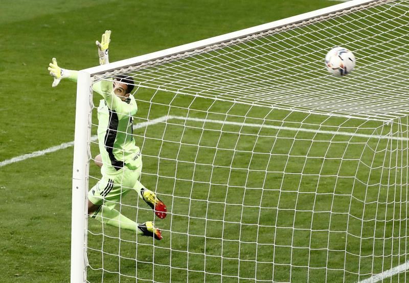 La igualdad del choque a punto estuvo de verse rota de no ser por la excepcional parada que hizo Sergio Herrera. El guardameta burgalés se lució para sacar un potente disparo del uruguayo Mauro Arambarri desde la frontal del área. Este fue el único tiro entre los tres palos que se vio en la primera mitad.