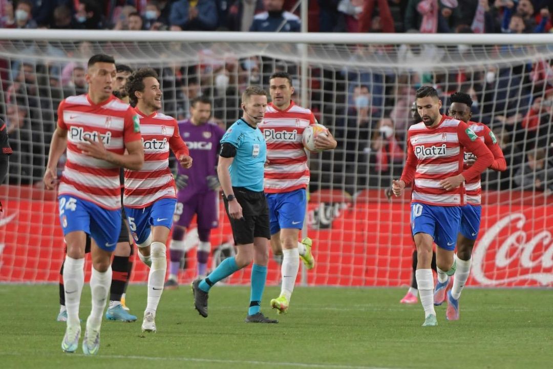 Los jugadores del Granada devuelven el esférico al centro tras anotar un tanto.Paco García Álvarez