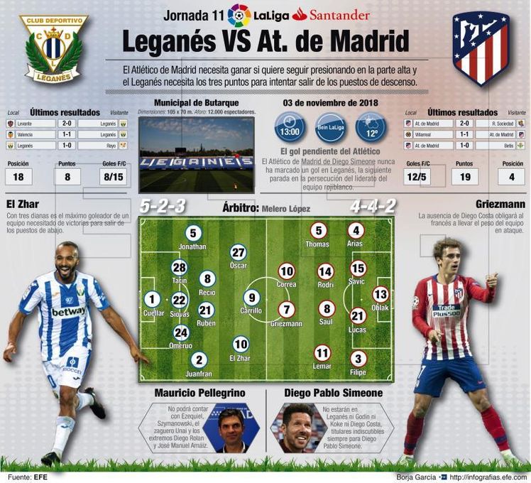 Puestos: Leganés (18º, 8 puntos); Atlético (4º, 19 puntos).
