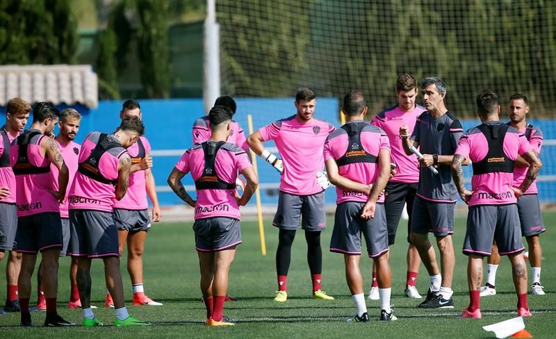 Los futbolistas del Levante han superado un exigente circuito físico en la primera parte de la sesión de trabajo y el técnico Juan Ramón López Muñiz preparó distintos ejercicios con balón y partidos condicionados a continuación.