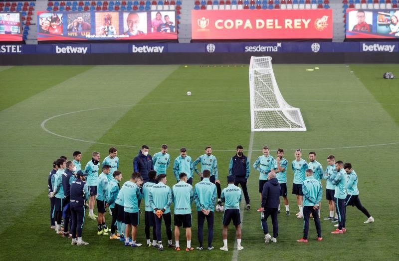 Al filo de las 12:30 horas los jugadores y técnicos del Levante han recibido el apoyo de los empleados de las oficinas del Ciutat de València antes de enfrentarse al Athletic Club en la vuelta de las semifinales de la Copa y tras el 1-1 de la ida.