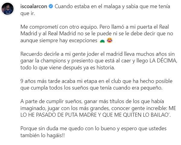Isco Alarcón es historia del Real Madrid. El malagueño puso el broche de oro a su periplo en el club blanco con la consecución de la decimocuarta Champions League tras obtener también el título de liga. Un adiós oficializado a través de su cuenta de Instagram donde publicó una carta de despedida al más puro estilo Isco Alarcón y con dardo incluido al fichaje frustrado de Kylian Mbappé.