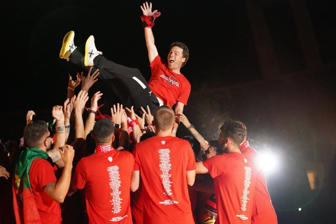 Rubi es manteado por los jugadores del Almería en la celebración del ascensoLuisma Sánchez