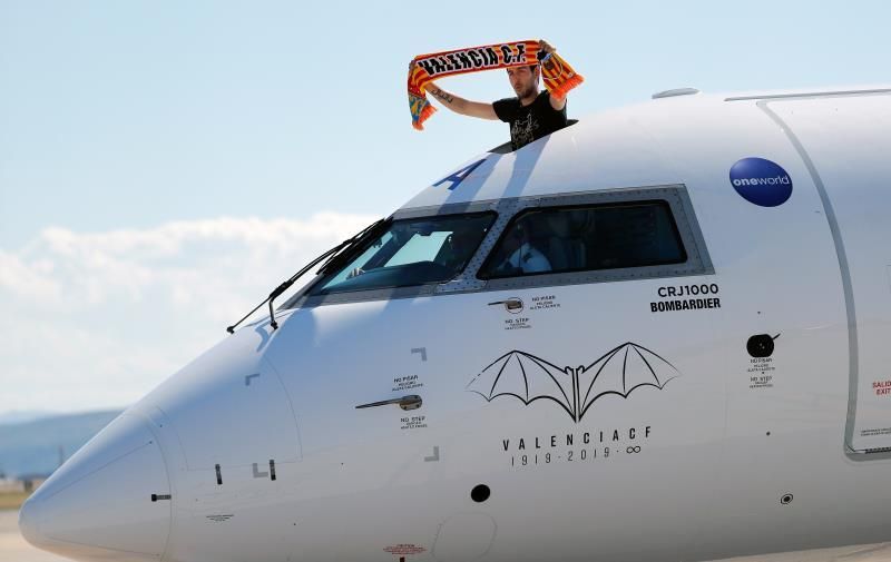 Parejo muestra una bufanda del Valencia desde una escotilla del avión