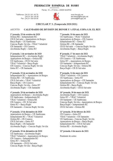 El Ciencias Olavide ya conoce su calendario de cara a la temporada 20/21 en la División de Honor de rugby y a la Copa del Rey. Una campaña que, en cuanto a la competición liguera, arrancará en casa el fin de semana del 24 y 25 de octubre frente al campeón VRAC Valladolid. Posteriormente, se las verá con Cisneros, Getxo, C.R. Santander, Alcobendas, Barça, El Salvador, Ordizia, Independiente, Aparejadores de Burgos y Santboiana.