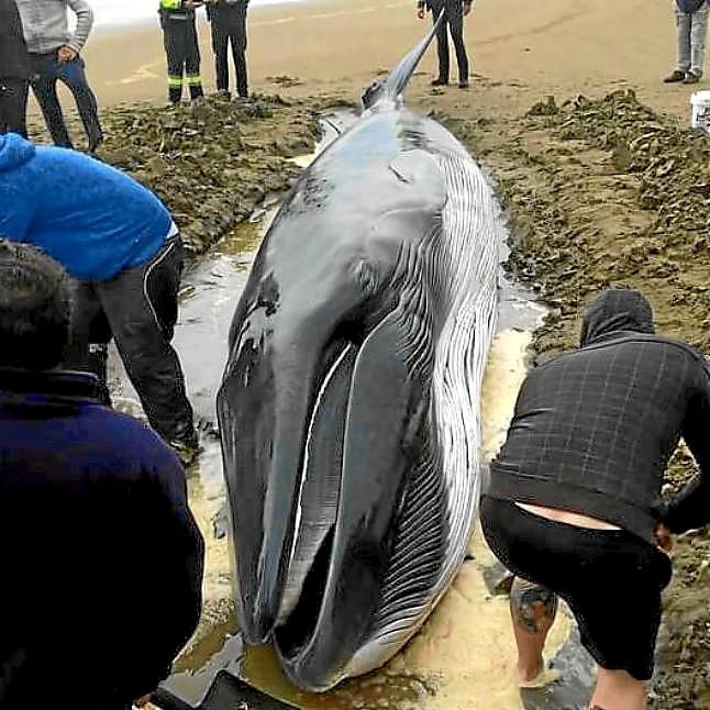 Los voluntarios han hecho una cadena humana para hidratar a la cría con cubos de agua a la espera de que la próxima marea alta, en torno a las 21:00 horas, pueda ayudar a devolverla al mar.