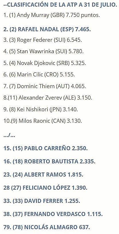 Por su parte, Albert Ramos es el otro español que sube, ya que se coloca el número 23 del mundo, pero tanto Feliciano López, Fernando Verdasco y Nicolás Almagro descienden una posición, colocándose 28º, 38º y 79º, respectivamente.