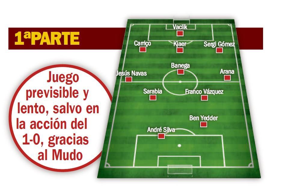 En el primer tiempo, Machín se encontró la horma de su zapato, pues los tres centrales y dos carrileros que dispuso el Celta permitió que hubiera pocos espacios, también por la presión de los vigueses, que atacaronn con pocos efectivos, pero apretaron bien arriba y forzaron el repliegue local con juego directo. Sevilla y Celta tocaban en zonas intrascendentes y lo intentaron, sobre todo, desde lejos. Los locales mandaban en esta fase, pero, sobre todo, moviéndola horizontalmente, sin profundidad y con imprecisiones... Salvo en la acción del 1-0, la única en que pudieron correr y pillar descolocados a los visitantes. El 'Mudo' condujo, vio el desmarque de Ben Yedder y su pase largo lo devolvió Navas al área para el gol de Sarabia.