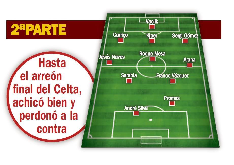 En ventaja, pronto también en efectivos, el guion se volvía perfecto para un cuadro nervionense menos incómodo con el marcador a favor, pues está claro que disfruta más al contragolpe. Con los celestes más abiertos y desesperados, la calidad de Franco Vázquez y el despliegue con espacios de los carrileros encajonaron a los de Antonio Mohamed, que acabarían claudicando, VAR mediante, antes de que Boufal pusiera emoción al final.