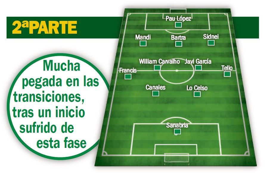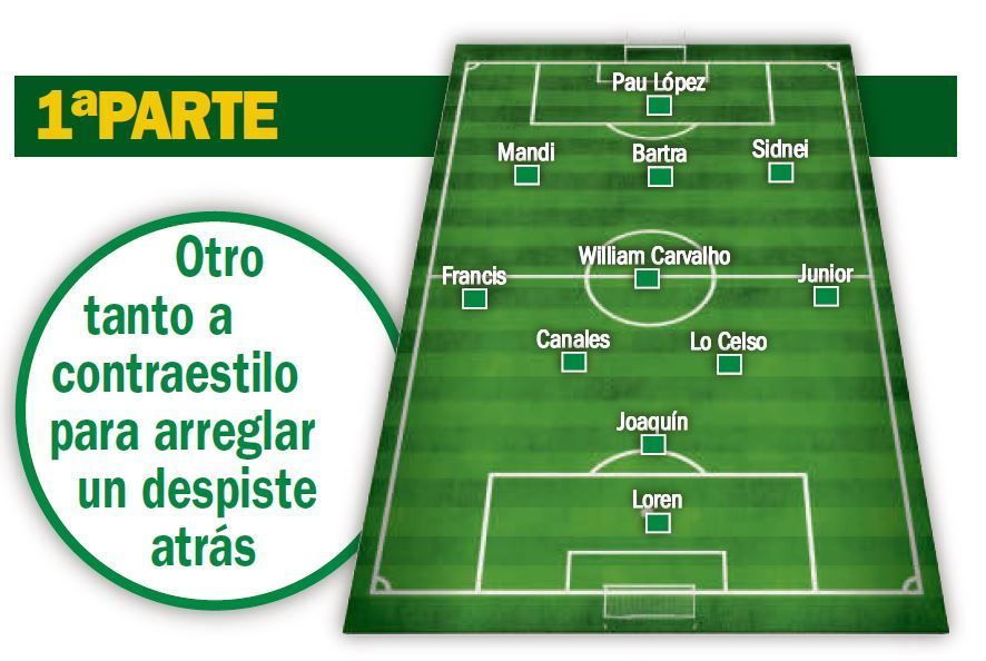 Desde el penalti fallado al gol del Espanyol en su primera llegada. Del arranque fulgurante de los 'pericos' en el segundo tiempo a una presión alta y asfixiante, ésta desde el inicio, tanto en la salida desde atrás heliopolitana como sobre los receptores de los pases interiores. Tras el punto de inflexión del penalti, anímica y deportivamente, y el 1-0, ya el achique era más escalonado; el rival esperaba más al Betis atrás para salir con transiciones rápidas, precisamente la forma en la que los visitantes ajusticiaron. Primero, antes del descanso, con Canales. Al final, por medio de Lo Celso, que forzó el autogol de Duarte.
