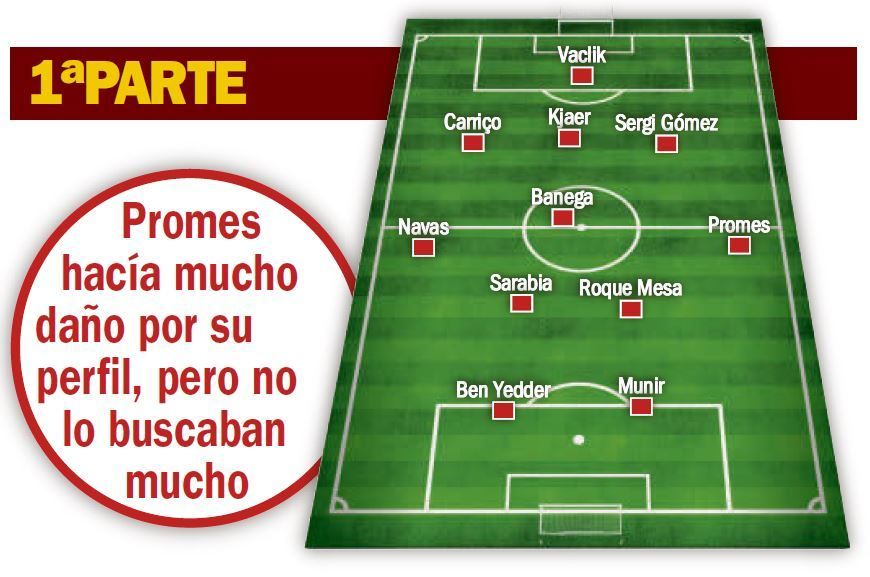 En el primer tiempo, los checos se impusieron siempre en los balones divididos, plasmando una mayor intensidad que incomodó, entre otros, a Ben Yedder, Munir o Sarabia, perjudicados también por el mal estado del césped y por la eficaz presión escalonada del Slavia, más pendiente de los posibles receptores que de quien tenía la pelota.