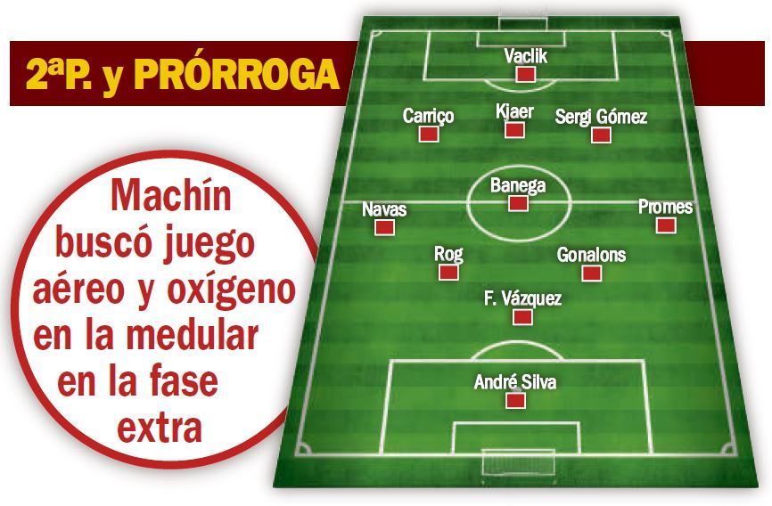 Otro error de bulto (penalti 'light' pero absurdo de Navas a Boril) estropeó el amago de reacción al filo del descanso (1-1 de Ben Yedder desde los once metros), aunque el golazo de Munir metía de lleno a un Sevilla que aguantó hasta forzar la prórroga. El tanto del Mudo en el 98 hizo que se las prometiera muy felices, pero el equipo de Machín acabó sepultado en la trinchera.
