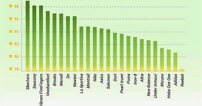 La lista de esta clasificación, de mejor a peor, es Skechers, Saucony, Vibram FiveFingers, Vivobarefoot, Brooks, Merrell, On, Newton, Montrail, La Sportiva, Nike, Asics, Salomon, Zoot, Pearl Izumi, Puma, Inov-8, Altra, Under Armour, Mizuno, Hoka One One, Adidas, New Balance y Reebok.