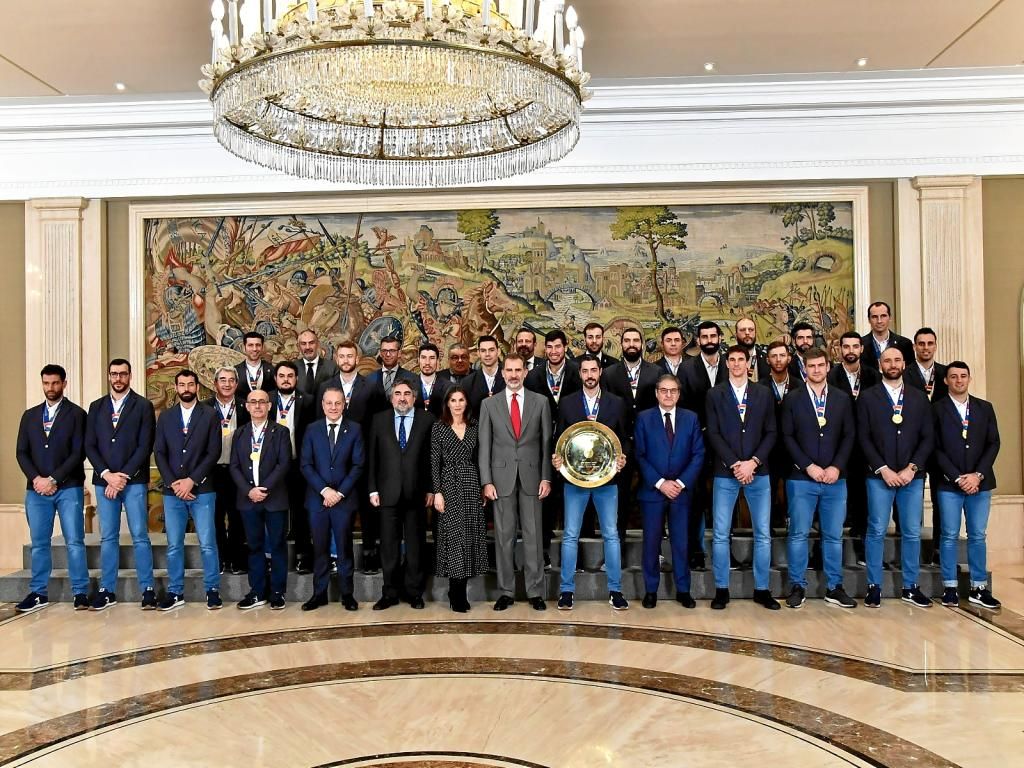 Los Reyes de España recibieron este martes a los integrantes de la selección masculina de balonmano, los Hispanos, después de que el pasado domingo revalidaran su título de campeones de Europa y les regalaron dos camisetas, con los nombres de Felipe y Letizia, para agradecerles su apoyo.
