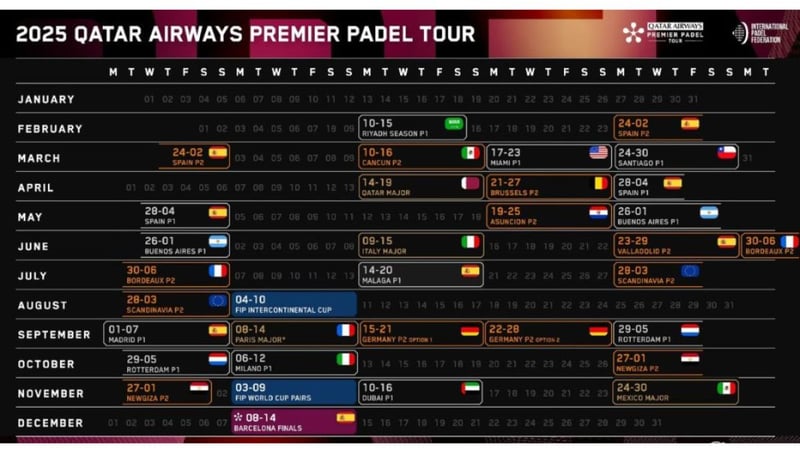 Barcelona ponía este domingo el punto final al circuito Premier Padel 2024 y, este lunes, la organización daba a conocer el calendario de la próxima temporada, en el que hay sorpresas, España gana peso y se repetirán los grandes eventos de este año 'inaugural', empezando por los cuatro Majors y acabando con las Premier Padel Finals en Barcelona.