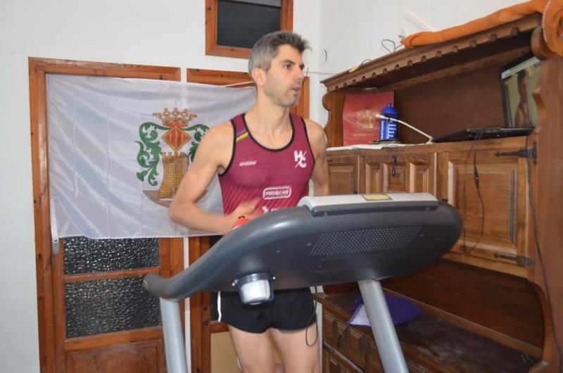 Catalá nadó en estático 1.900 metros en una piscina hinchable de tres metros de diámetro y setenta centímetros de profundidad, después hizo 90 kilómetros en una bicicleta con rodillo y acabó corriendo en cinta 21 kilómetros.