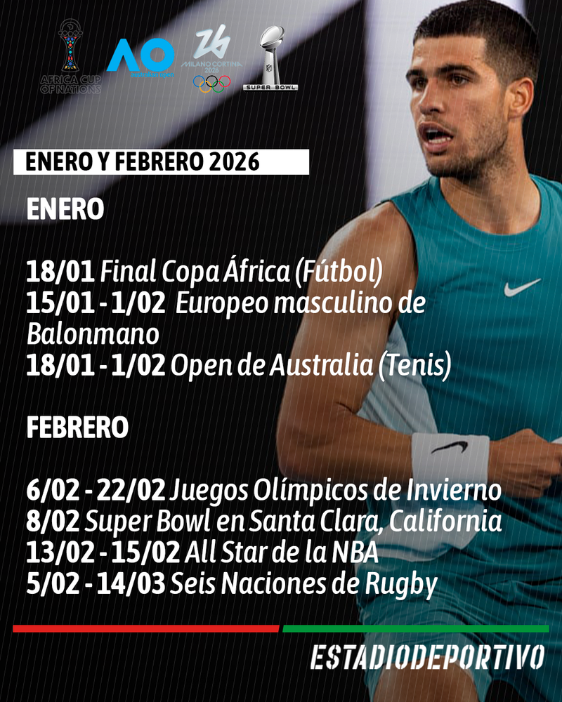 A continuación repasamos, mes a mes, los eventos deportivos más destacados de año. Sabedores de que seguro nos dejamos algo en el tintero ya que, afortunadamente, el deporte es tan amplio que siempre habrá mucho más que ver y disfrutar.