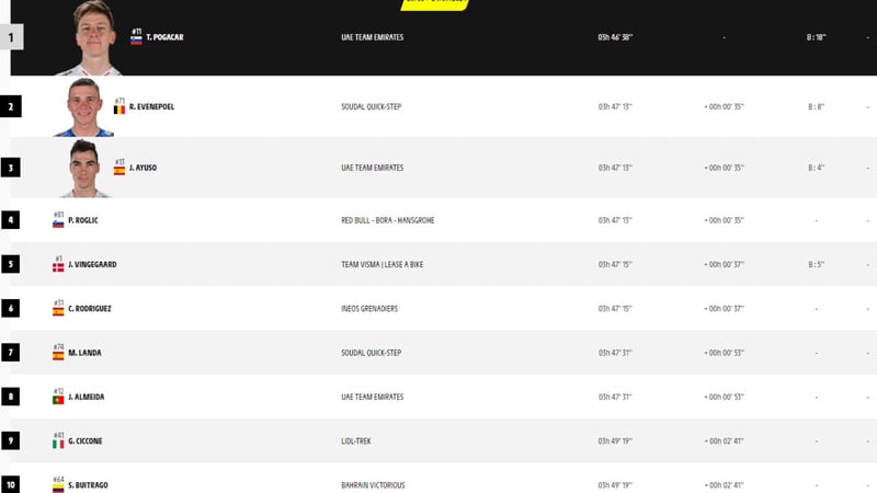 El ciclista del UAE distanció en la meta en 35 segundos al belga Remco Evenpoel, que fue segundo, a su compañero español Juan Ayuso y al esloveno Primoz Roglic, mientras que el danés Jonas Vingegaard, ganador de las dos últimas ediciones del Tour, y el español Carlos Rodríguez, quinto el año pasado, entraron dos segundos más tarde.