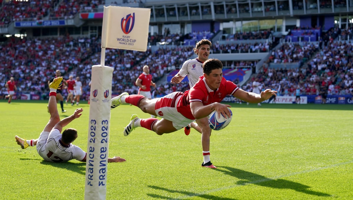Louis Rees-Zammit disputando un partido del Mundial de rugby con la selección de GalesCordon Press