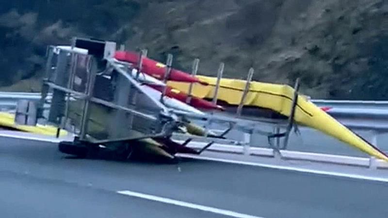 El remolque, en el que transportaban once piraguas de K1, con una longitud de 5,20 metros cada una, y dos de K4, con 11 metros de largo, ante la entrada encañonada de las fuertes rachas de viento hizo "efecto de vela".
