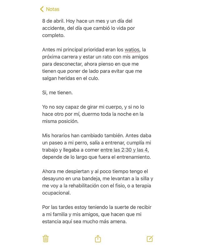 "Hoy hace un mes del día del accidente, del día que me cambió la vida por completo", de esta forma comienza un texto muy duro. En él Sergio muestra su nueva realidad y cómo ha cambiado todo lo que antes era importante en su día a día: "Antes mi principal prioridad eran los vatios, la próxima carrera y los amigos, ahora pienso en que me tienen que poner de la lado para evitar que me salgan heridas en el culo", expresa el joven de 26 años.