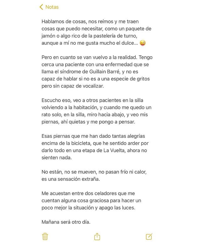 Están siendo momentos muy difíciles para Sergio Martín: "No están, no se mueven, no pasan frío ni calor, es una sensación extraña", continúa hablando sobre sus piernas. Para acabar su carta justamente contando cómo acaba su día a día actual: "Me acuestan entre dos celadores que me cuentan alguna cosa graciosa para hacer un poco mejor la situación y apago las luces. Mañana será otro día”. Muy duro el relato del ciclista que el pasado 8 de marzo perdió la movilidad de sus piernas en un durísimo accidente.