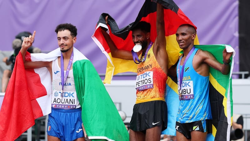 Los dos atletas entraron al estadio junto con el italiano Iliass Aouani, que pronto se quedó descolgado al enfilar la primera curva. Luego, Petros tomó ventaja y parecía que iba a ganar, pero flojeó al final y Simbu le adelantó en la misma llegada.