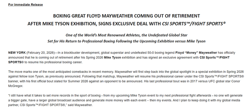 "Todavía tengo lo necesario para lograr más récords en el boxeo. Desde mi próximo evento con Mike Tyson hasta mi siguiente pelea profesional después de eso, nadie tendrá un impacto mayor en las taquillas, tendrá una audiencia global de transmisión más grande ni generará más dinero con cada evento", asegura Mayweather.