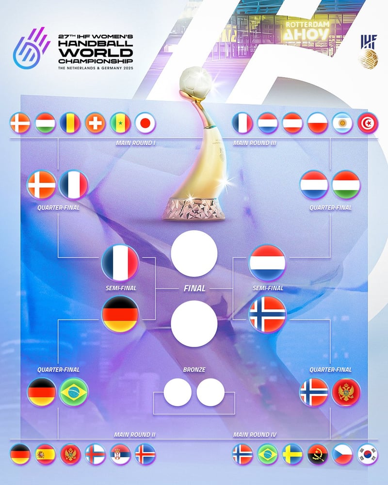 De este modo, tenemos que las selecciones de Francia, defensora del título, y Noruega, cuatro veces campeona del mundo, se enfrentarán respectivamente a las dos anfitrionas, Alemania y Países Bajos, en las semifinales del torneo, las cuales tendrán lugar este sábado 13 de diciembre.