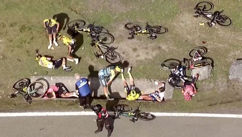 El pasado jueves 4 de abril, en el tramo entre Etxarri y Legutio, Vingegaard sufrió una caída en Olaeta, en dirección a Cruceta. La curva carece de peralte adecuado, y el firme está lleno de raíces del bosque, lo que lo hace muy peligroso, y la velocidad a la que todos tomaron la curva fue excesiva. Se estima que Evenepoel se estrelló a una velocidad de 88,2 kilómetros por hora. El danés fue trasladado en camilla, con inmovilización y collarín, y necesitó oxígeno artificial. Su participación en el Tour podría estar en riesgo, aunque ahora mismo ese sea el menor de los problemas tanto para él como para su familia.